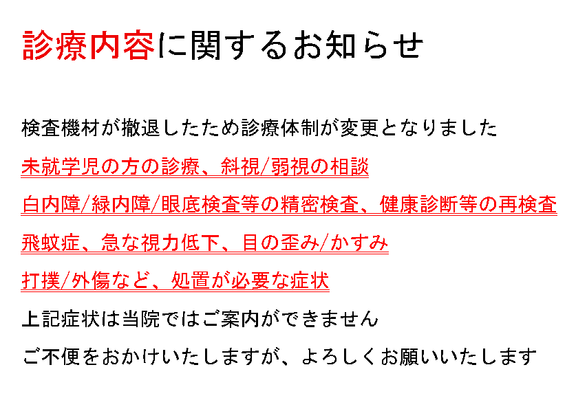 診療内容変更に伴い、5月17日より、緑内障/白内障/眼底検査/健康診断の再検査/打撲/外傷/目のかすみ/飛蚊症などの眼底の精密検査や処置が必要な症状に関する診療が行えなくなりました。