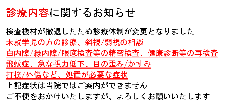 斜視/弱視の相談、白内障/緑内障/眼底検査等の精密検査、健康診断等の再検査